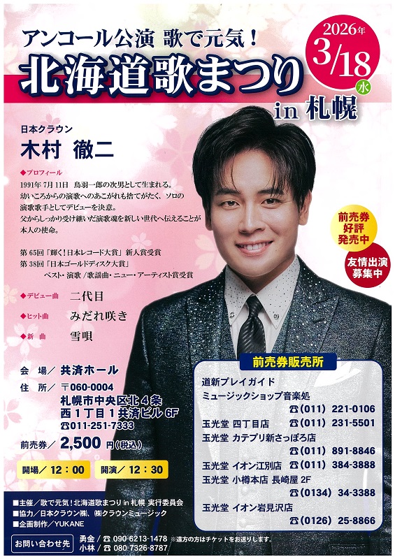 アンコール公演 歌で元気! 「北海道歌まつり in 札幌」 チケットお取扱中です。 ◆ゲスト:木村徹二 ◆日時:2026年3月18日(水) OPEN 12:00 / START 12:30 ◆会場:共済ホール(札幌市中央区北4条西1丁目1 共済ビル6F) ◆料金:前売り 2,500円 店頭にて |