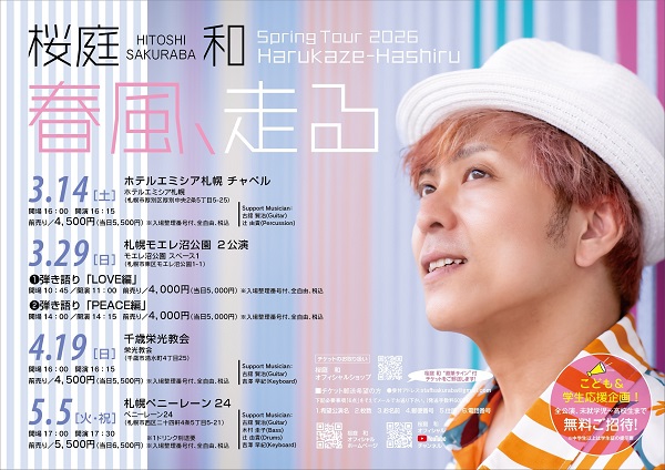 桜庭 和さん「21st SPECIAL ANNIVERSARY LIVE at豊平館」のライブチケット お取扱中です。 ◆日時:2026年2月23日(月) OPEN 18:45 / START 19:00 ◆会場:豊平館 2階 広間(札幌市中央区中島公園1番20号) ◆料金:前売り4,400円※入場整理番号付き 店頭にて |